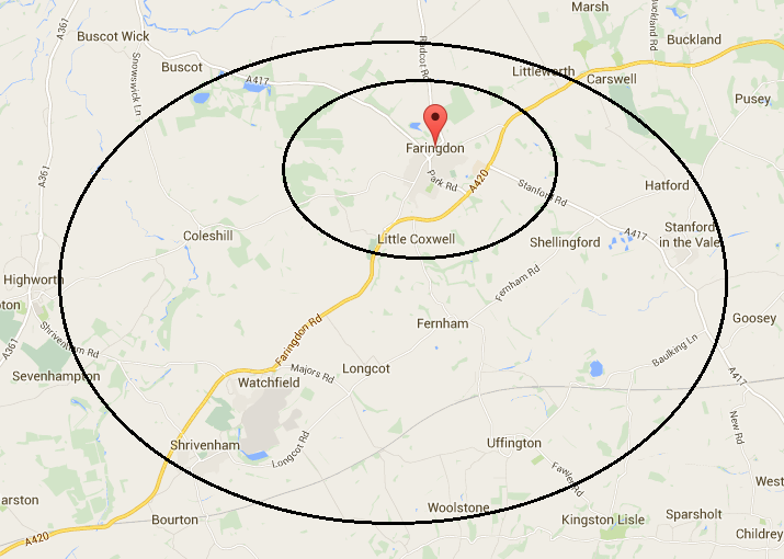 We currently cover an area up to 5 miles from Faringdon, which includes the following villages (you can click the map to see a bigger version):